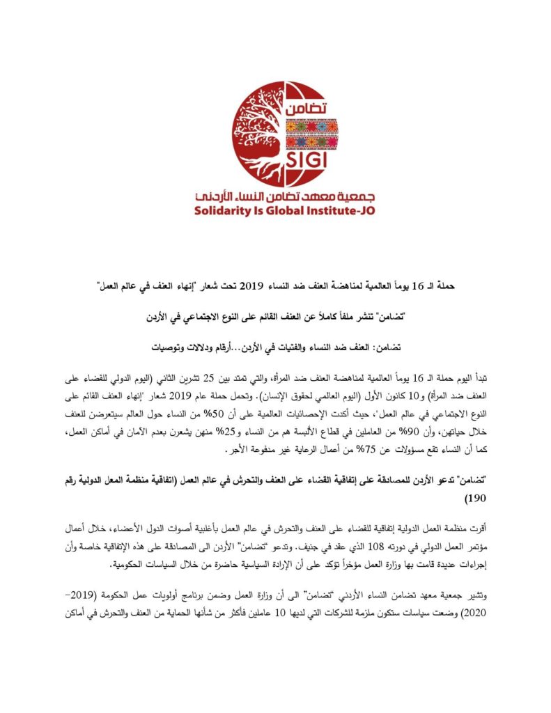 حملة ال 16 يوماً العالمية لمناهضة العنف ضد النساء 2019 تحت شعار “إنهاء العنف في عالم العمل”