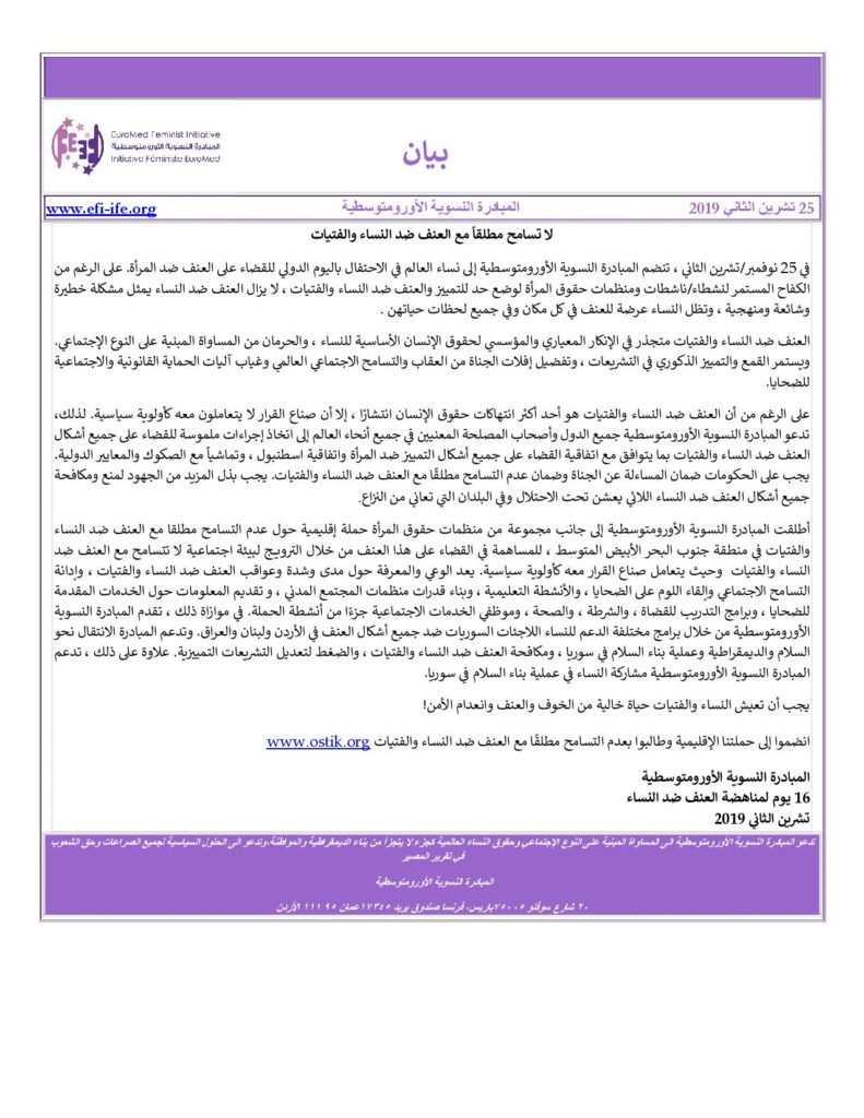 بيان المبادرة النسوية الأورومتوسطية:لا تسامح مطلقا مع العنف ضد النساء والفتيات